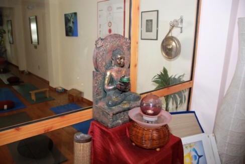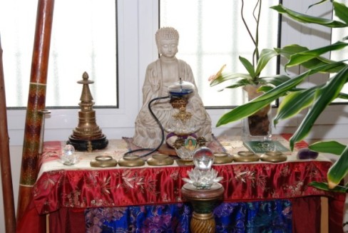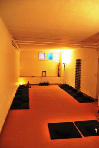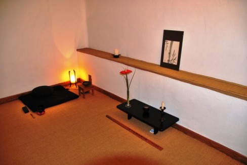 Ni Buda ni Cristo: dojo de Concha Quintana (discípula de Karlfried Durckheim) en Madrid, no hay símbolos religiosos, solo una sala de meditación con una caligrafía, un arreglo floral y una vela |